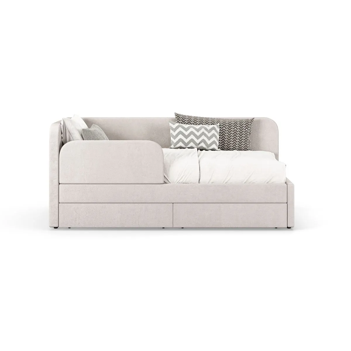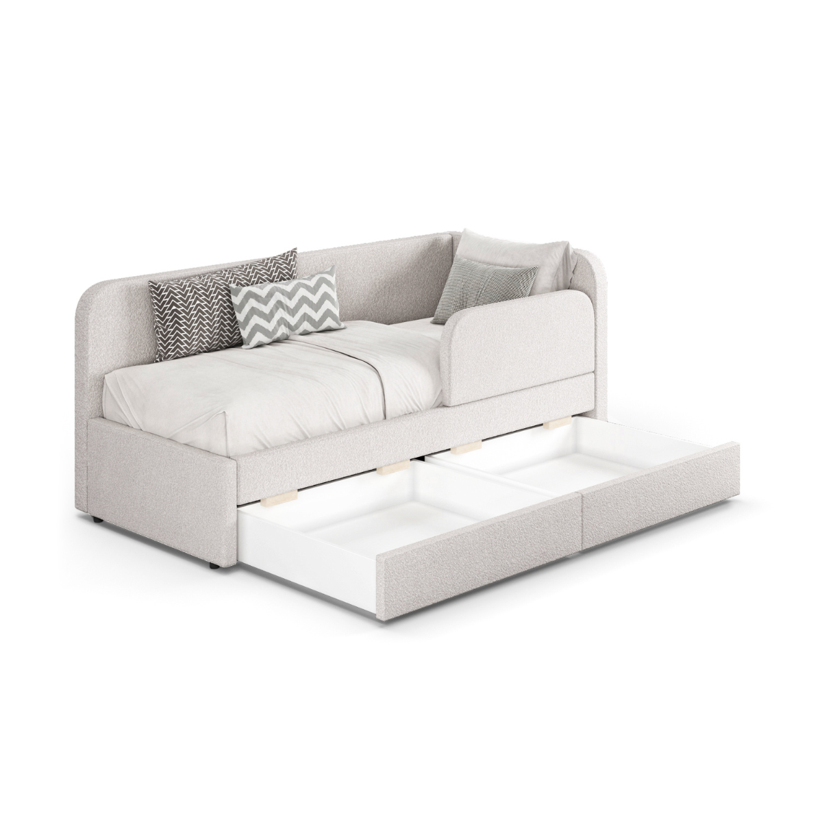 Wyposażone w dwie pojemne szuflady, łóżko oferuje dodatkowe miejsce na przechowywanie pościeli, ubrań czy zabawek. To praktyczne rozwiązanie, które pomaga utrzymać porządek w dziecięcej przestrzeni. Nowoczesny wygląd, solidne wykonanie i funkcjonalność czynią ten mebel doskonałym wyborem do każdego stylowego pokoju dziecięcego.