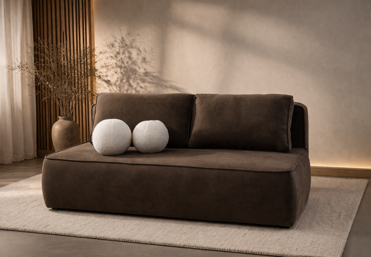 Forma inspirowana stylem japandi łączy minimalistyczną estetykę z naturalnymi proporcjami i spokojną kolorystyką. Dzięki temu sofa Prime Mini świetnie wpisuje się w jasne, nowoczesne wnętrza i tworzy przytulną przestrzeń do codziennego odpoczynku.